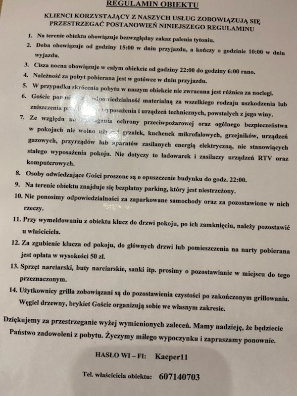 W budynku obowiązuje zmiana obuwia. Jesteśmy małym obiektem , nastawionym na rodzinny wypoczynek, a nie hotelem